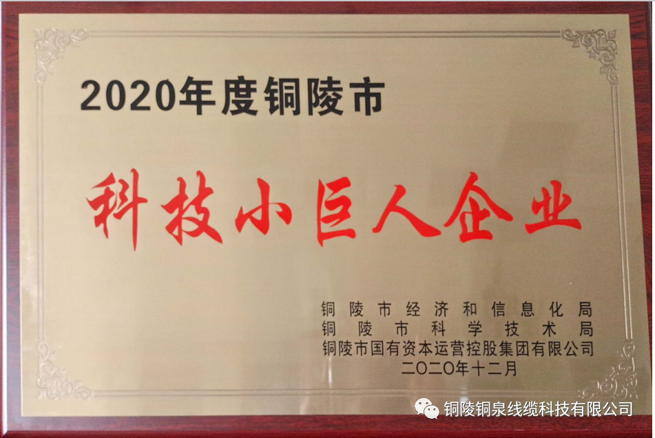 近日,銅陵市經濟和信息化局公布了2020年度銅陵市“科技小巨人企業(yè)”,銅陵銅泉線纜科技有限公司榜上有名,成功獲評。此次榮譽稱號的獲得,體現了有關部門對銅泉線纜科技綜合實力的充分肯定和鼓勵,是對我們堅持科技創(chuàng)新并取得良好經營業(yè)績的高度認可。
